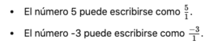 Ahora, piensa que cualquier número entero, como 5 o -3, también puede escribirse como una fracción. Por ejemplo:
